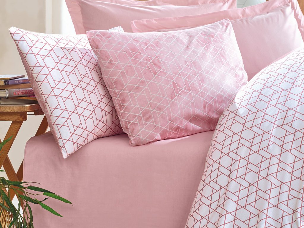Jednoduché povlečení s geometrickým vzorem v reverzním provedení v bílo-růžové kombinaci.