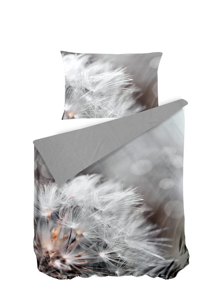 Digitální potisk povlaku polštáře i přikrývky je proveden pouze z jedné strany. U povlaku na polštář najdete z druhé strany dotisk motivu pampelišky, povlak na přikrývku je z druhé strany pouze melírovaný ve světle šedé barvě.