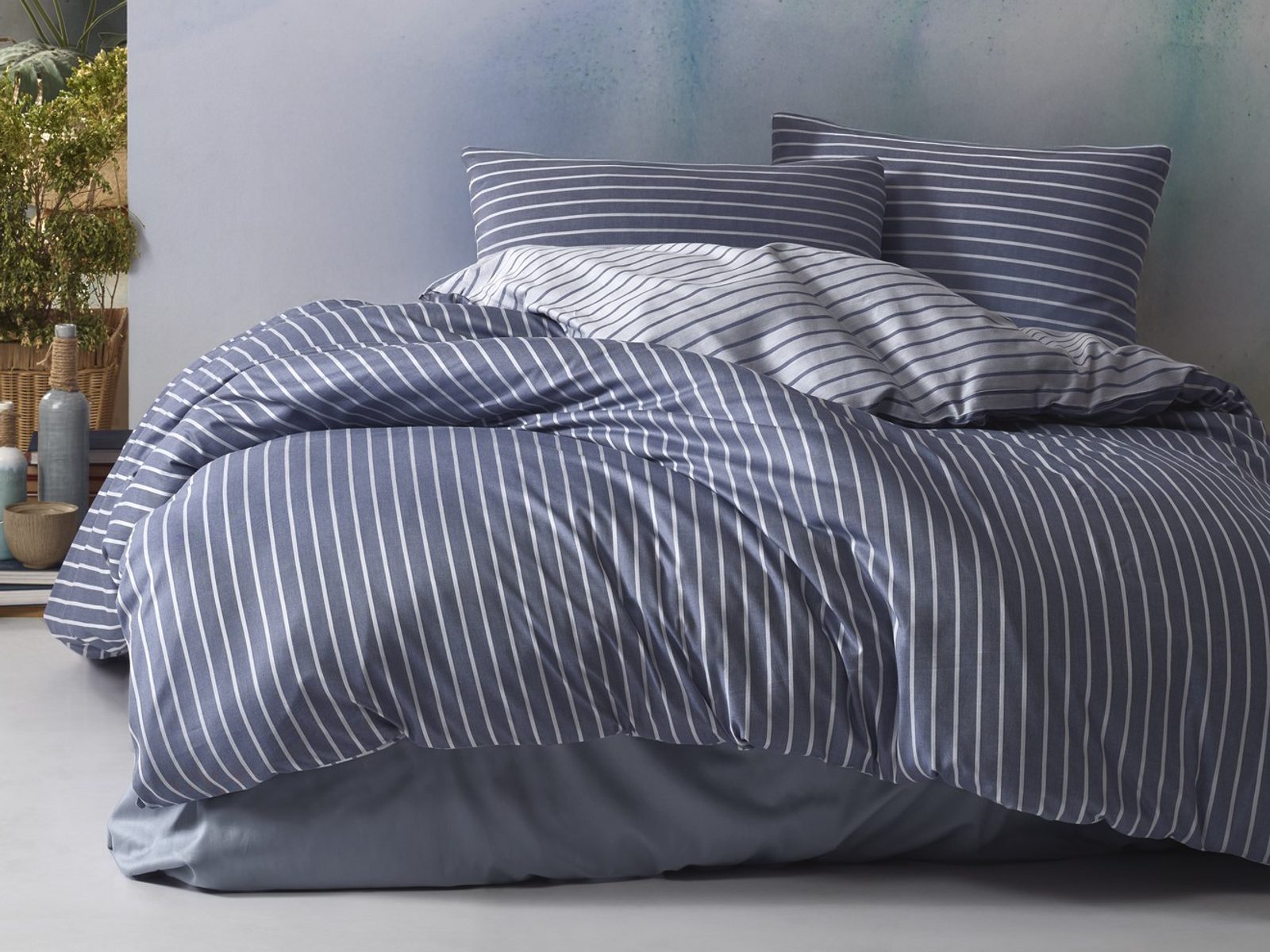 Tmavě modré bambusovo-bavlněné povlečení v saténové úpravě. Z jedné strany je povlak na přikrývku tmavě modrý s bílými pruhy, z druhé strany je vzor reverzní - bílý podklad s modrými pruhy. Povlaky na polštáře nemají lem a jsou tmavé z obou stran.