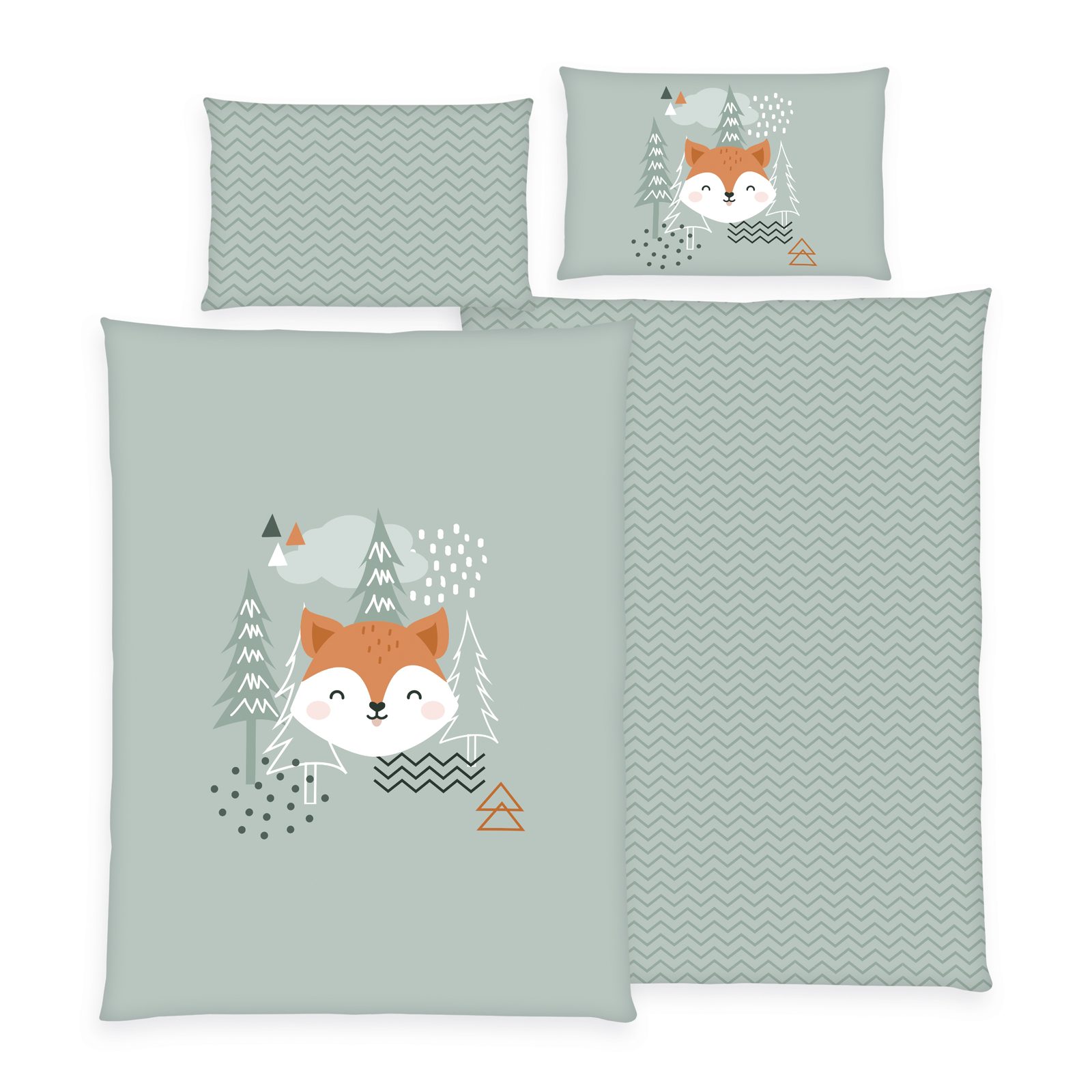 Oboustranné designové povlečení pro děti. V šedozeleném odstínu, s motivem lišky.