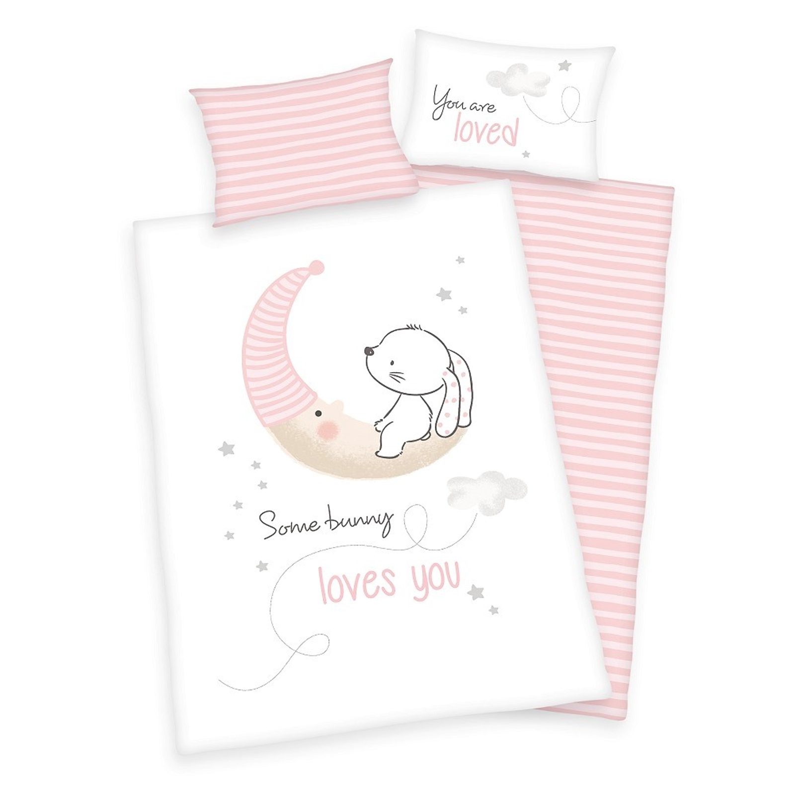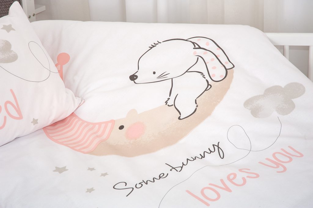 Roztomilé povlečení na přikrývku a polštářek pro miminka. Zajíček na měsíčku z jedné strany a z druhé jemné proužky na růžovém pozadí.