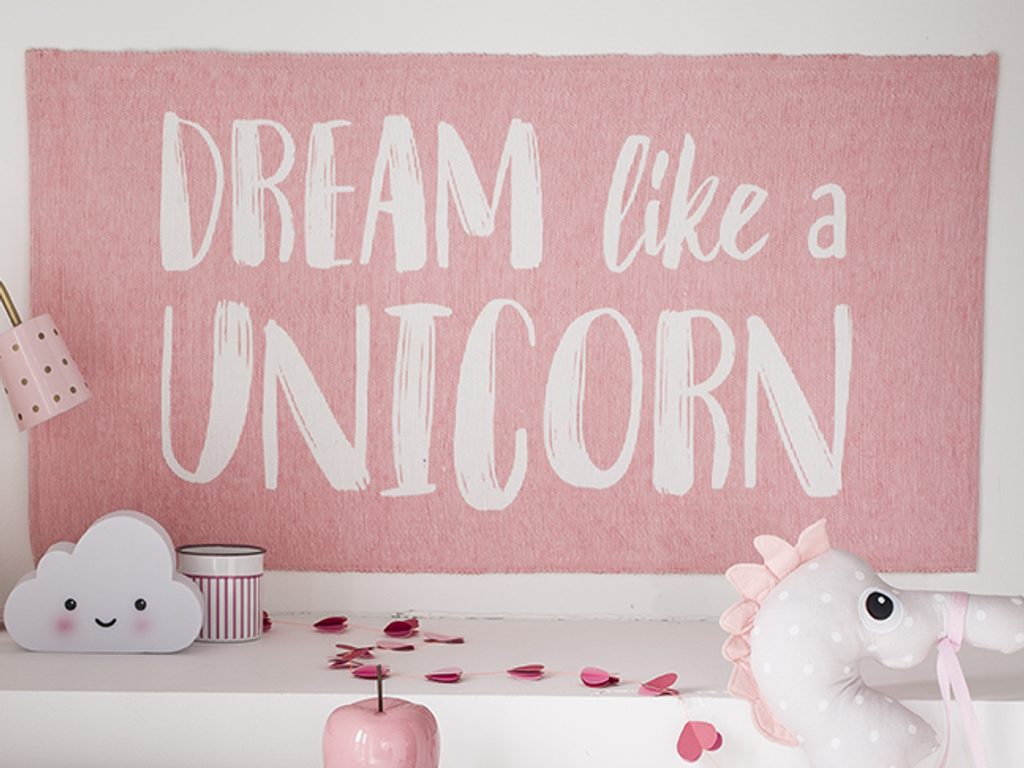 Bavlněný tkaný koberec do dětského pokojíku - na hraní i jen tak pro parádu. Sněte jako jednorožec - nápis na lososově růžovém podkladu.