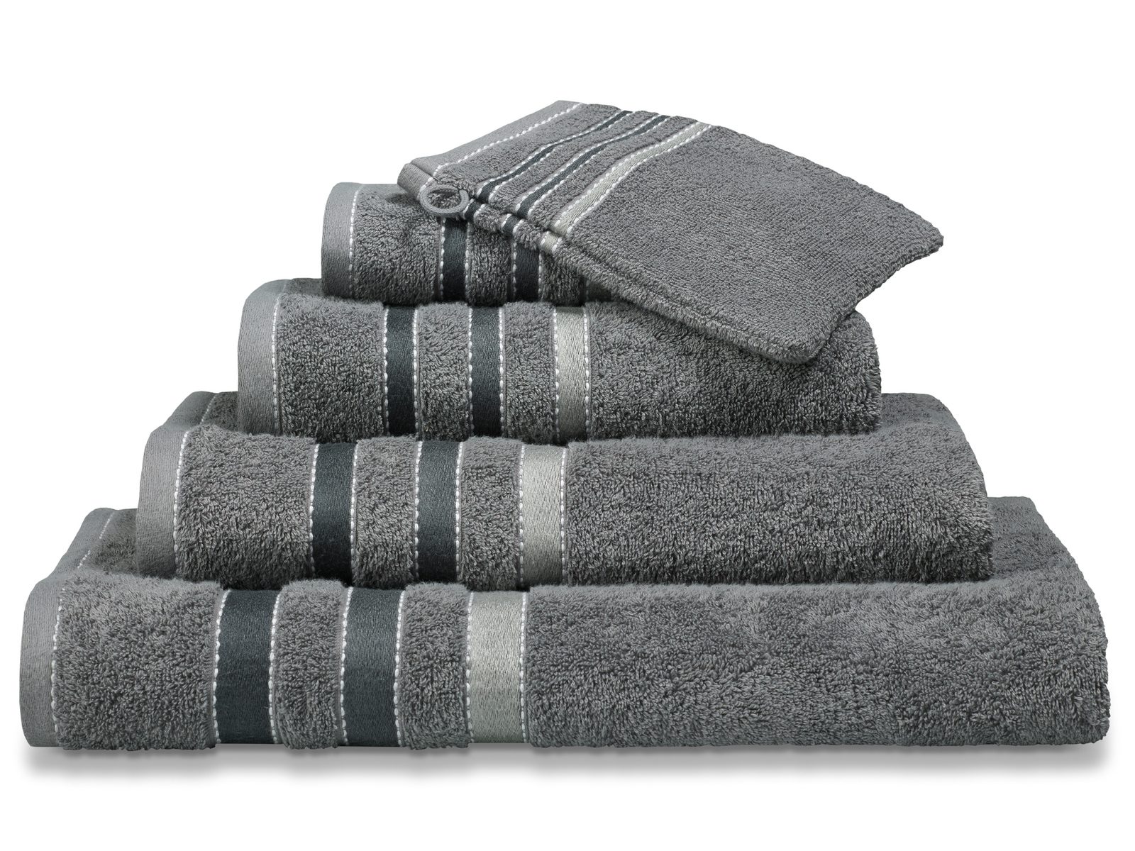 Jednobarevné ručníky s dekorativními bordurou - lesklé pruhy v různých odstínech s bílým prošitím jsou stylovým detailem.